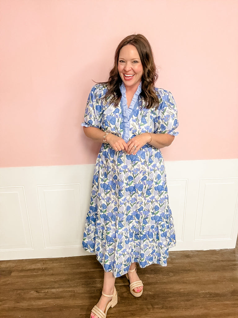 Sweet, feminine, and easy to wear, the Bluebell Meadow Ruffle Dress features a soft blue floral print on a light, airy fabric. Designed with a ruffled V-neckline, gently fluttered sleeves, and an elastic waist for a flattering, comfortable fit. This dress is perfect for spring events, church, brunch, or everyday errands—just add sandals or wedges for an effortlessly polished look.