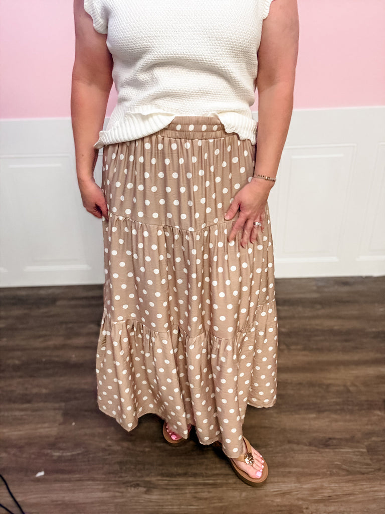 The Sweet Spot Polka Dot Skirt is the perfect mix of playful and easy-to-wear. This soft taupe skirt features classic white polka dots with a comfortable elastic waistband that makes it effortless to slip on and go. The tiered silhouette creates beautiful movement and gives it that relaxed, flowy feel that’s perfect for everyday wear. Pair it with a simple tee, lightweight sweater, or a bright spring top for an outfit that works for church, errands, or lunch with friends. Comfortable, cute, and easy to style — it’s the kind of skirt you’ll reach for all season long.