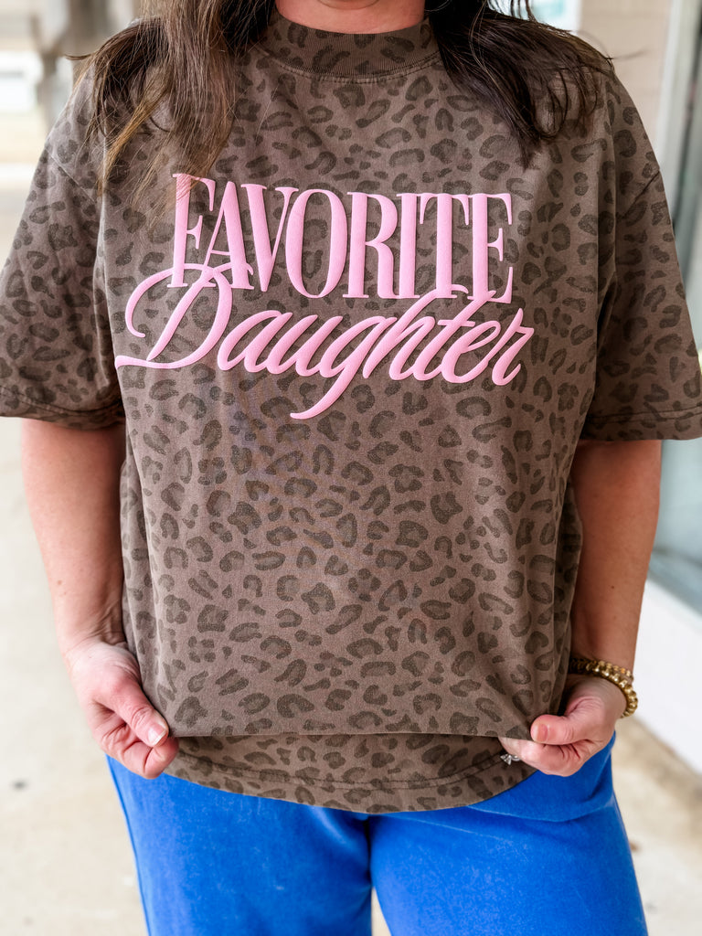 Our Favorite Daughter Tee features a soft mocha leopard base with the prettiest blush pink lettering for that perfect mix of bold + feminine. This relaxed-fit graphic tee is lightweight, comfy, and easy to style—front-tuck it into denim, throw on with biker shorts, or layer under a shacket for year-round wear. It’s playful, sassy, and guaranteed to be a customer favorite.