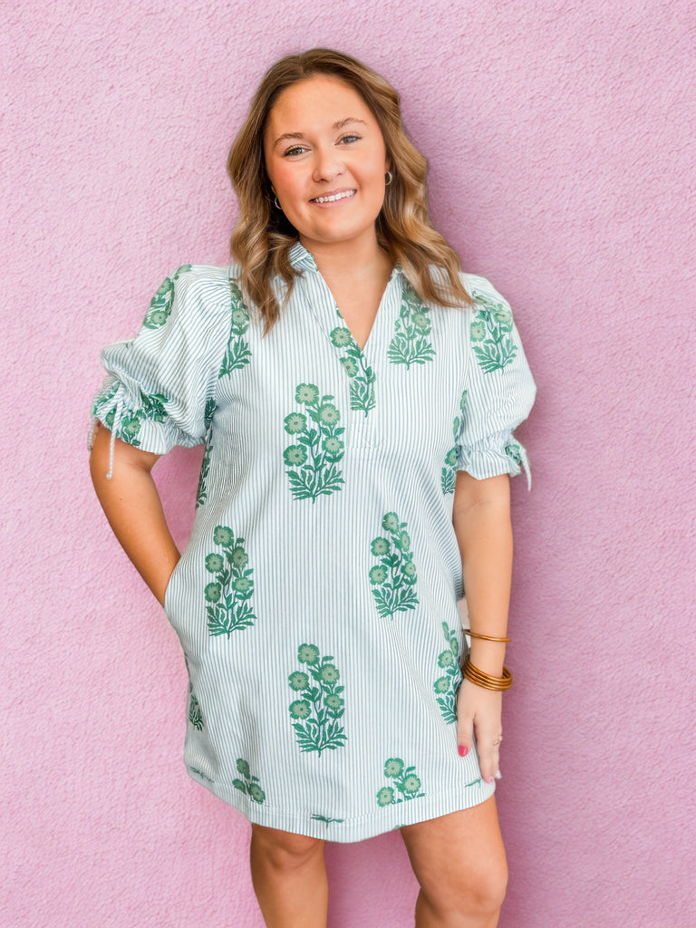 Classic stripes meet charming florals in the Garden on the Coast Shirt Dress. Featuring soft blue-and-white pinstripes with delicate green floral motifs, this relaxed button-front dress gives effortless coastal-grandma vibes with a fresh, botanical twist. The collared neckline and easy silhouette keep it polished, while the gathered tie sleeves add a playful, feminine detail. Lightweight and breezy, it’s perfect for brunch dates, beach town strolling, or casual days when you still want to feel put-together and pretty.