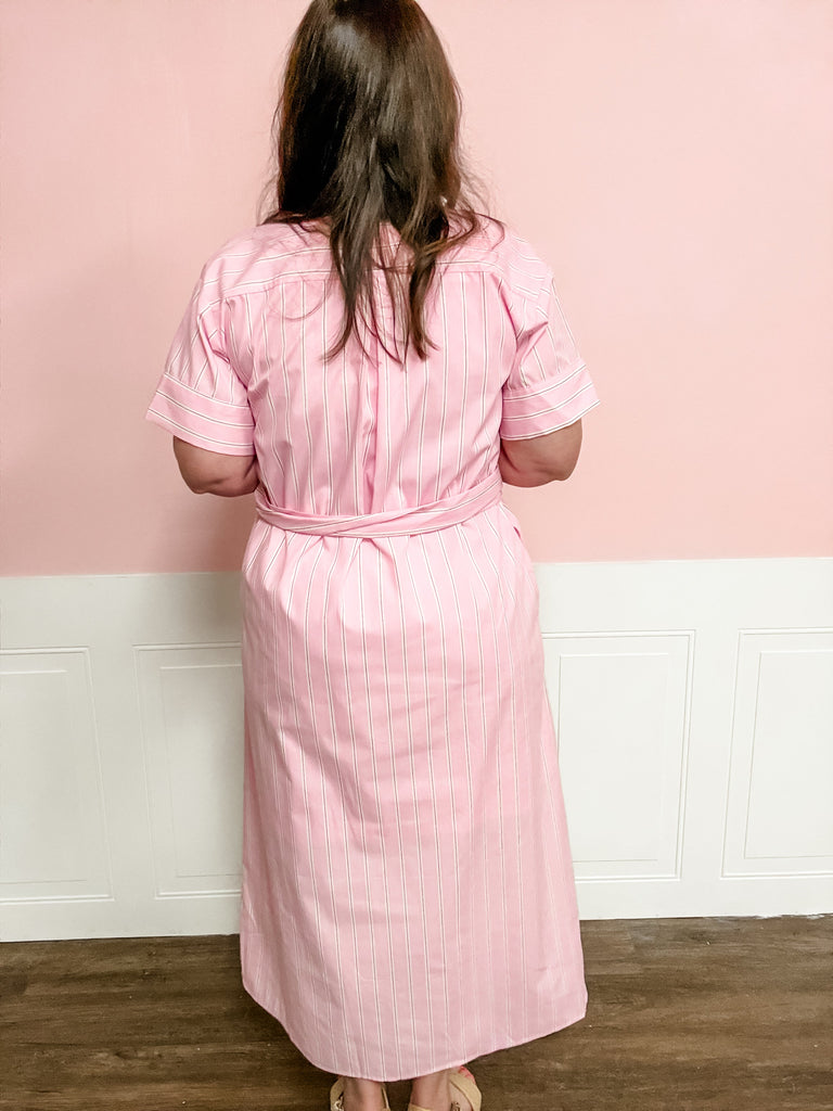 Soft, feminine, and effortlessly polished. This blush pink striped dress features a high ruffled neckline, short sleeves, and a flattering tie waist that cinches you in just right. The lightweight fabric keeps it comfortable for all-day wear, while the clean vertical stripes give it a classic, timeless feel. Perfect for work, church, or any dressed-up everyday moment—just add sandals or wedges and you’re good to go.