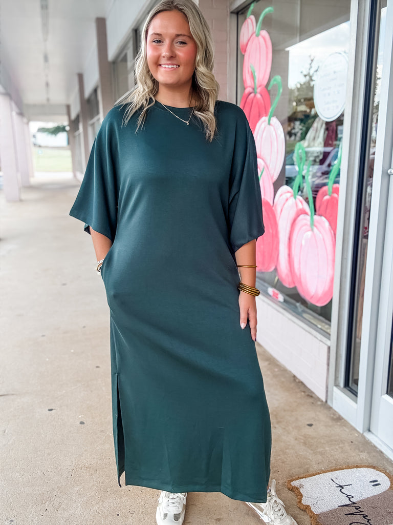 Simple, soft, and effortlessly stylish—this forest green dress is the definition of everyday ease. Designed with a relaxed fit, flattering length, and the always-loved addition of pockets, it’s perfect for dressing up with boots or keeping casual with sneakers. A true go-to for comfort and confidence.