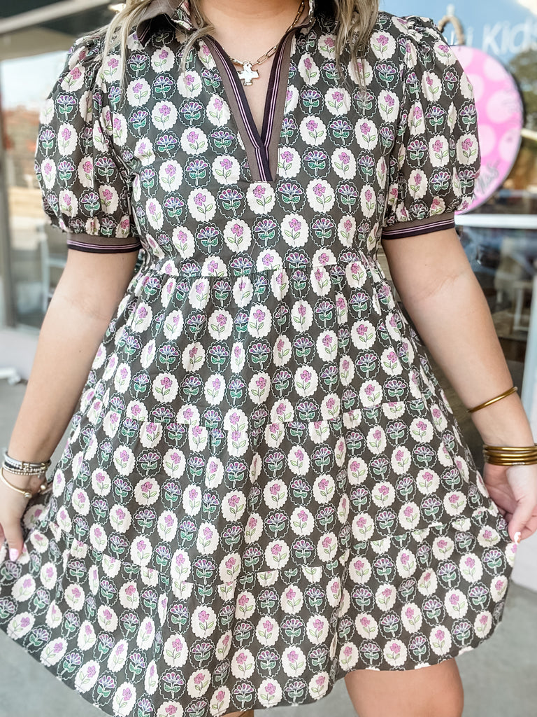 Sweet, timeless, and full of charm — the Vintage Bloom Dress is a best-seller for a reason! Featuring a retro-inspired floral print in soft pinks and taupes against a chocolate brown background, this dress gives all the cozy fall feels. The collared neckline, contrast trim, and subtle puff sleeves add a touch of structure, while the flowy skirt keeps it feminine and easy to wear. Perfect for brunch, fall festivals, or casual days out — this dress pairs beautifully with ankle boots and a smile.