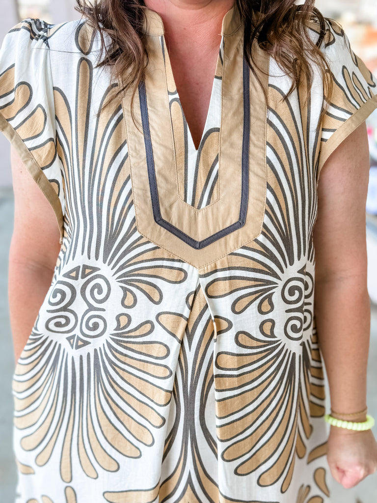 Make a bold statement in the most effortless way! This stunning Umgee shift dress features a gorgeous tan + black abstract safari print with a flattering v-neck notched neckline and chic contrast trim detail. The relaxed fit keeps it comfy and easy to wear, while the short puff sleeves add the perfect touch of feminine charm. Dress it up with wedges or keep it casual with sandals—either way, she’s a showstopper!