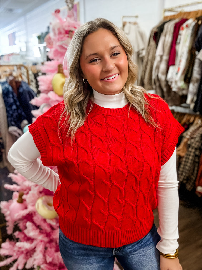 Bold, bright, and beautifully classic — the Sleigh All Day Sweater Vest is your go-to piece for effortless holiday chic. This vibrant red cable-knit design features a cozy crew neckline and relaxed, slightly boxy fit that layers perfectly over blouses or long sleeves. Whether you dress it up with a skirt or keep it casual with jeans, this sweater vest brings festive flair and timeless style to any winter outfit.