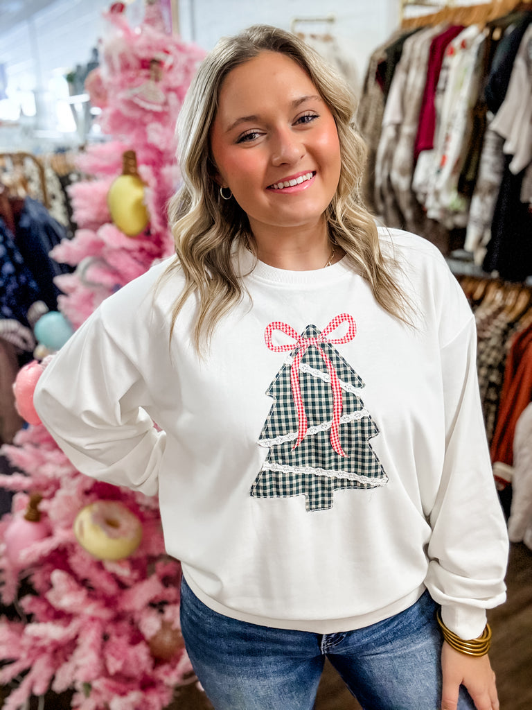Bring a touch of farmhouse charm to your holiday wardrobe with the Gingham Greetings Sweatshirt. Featuring a cozy cream base and an adorable green gingham Christmas tree trimmed with lace and topped with a red gingham bow, this sweatshirt blends classic country style with festive cheer. Soft, comfy, and effortlessly cute — it’s perfect for holiday gatherings, cookie baking, or simply spreading Christmas joy in cozy style.