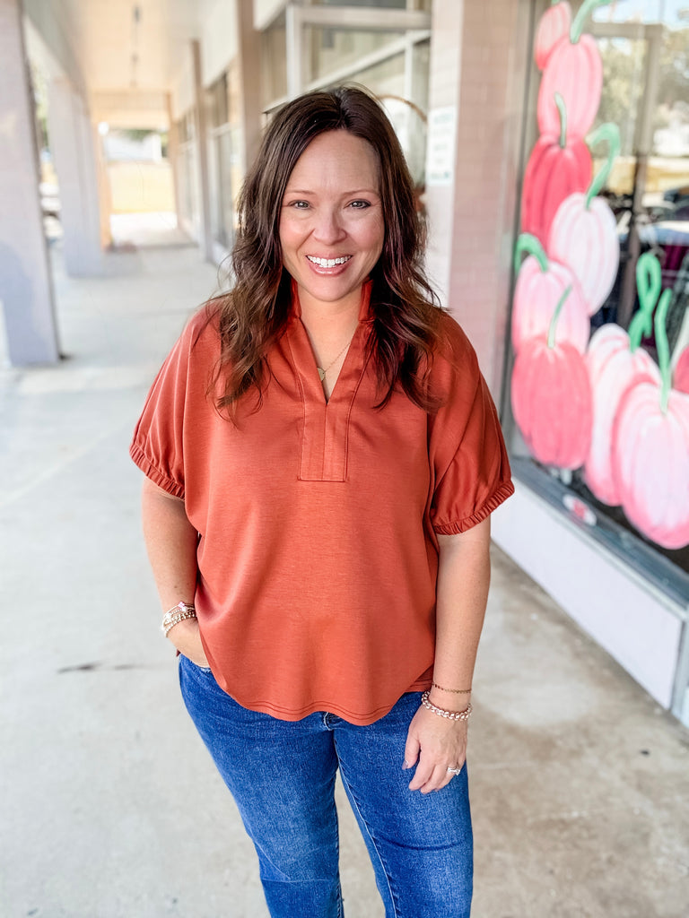 Bring warm fall vibes into your wardrobe with the Autumn Ridge Notch Top. Crafted in a rich burnt orange hue, this relaxed-fit top features wide short sleeves, a flattering notch neckline, and an easy drape that’s perfect for layering or wearing solo. Pair it with jeans for a casual day out or dress it up with statement accessories for a chic seasonal look.