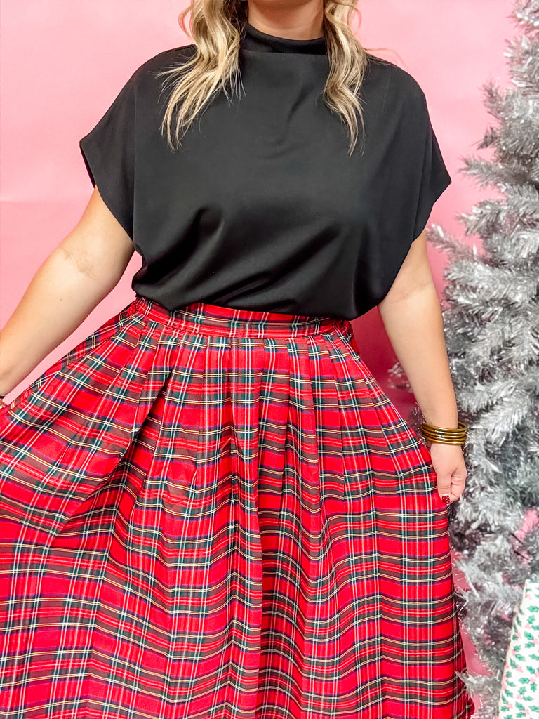 The Holly Jolly Plaid Skirt captures all the cozy, classic charm of the season. Featuring a rich red tartan print with deep green and gold accents, this pleated midi skirt brings timeless holiday elegance to any outfit. The elastic waistband offers a comfortable fit while the flowing silhouette moves beautifully with every step.