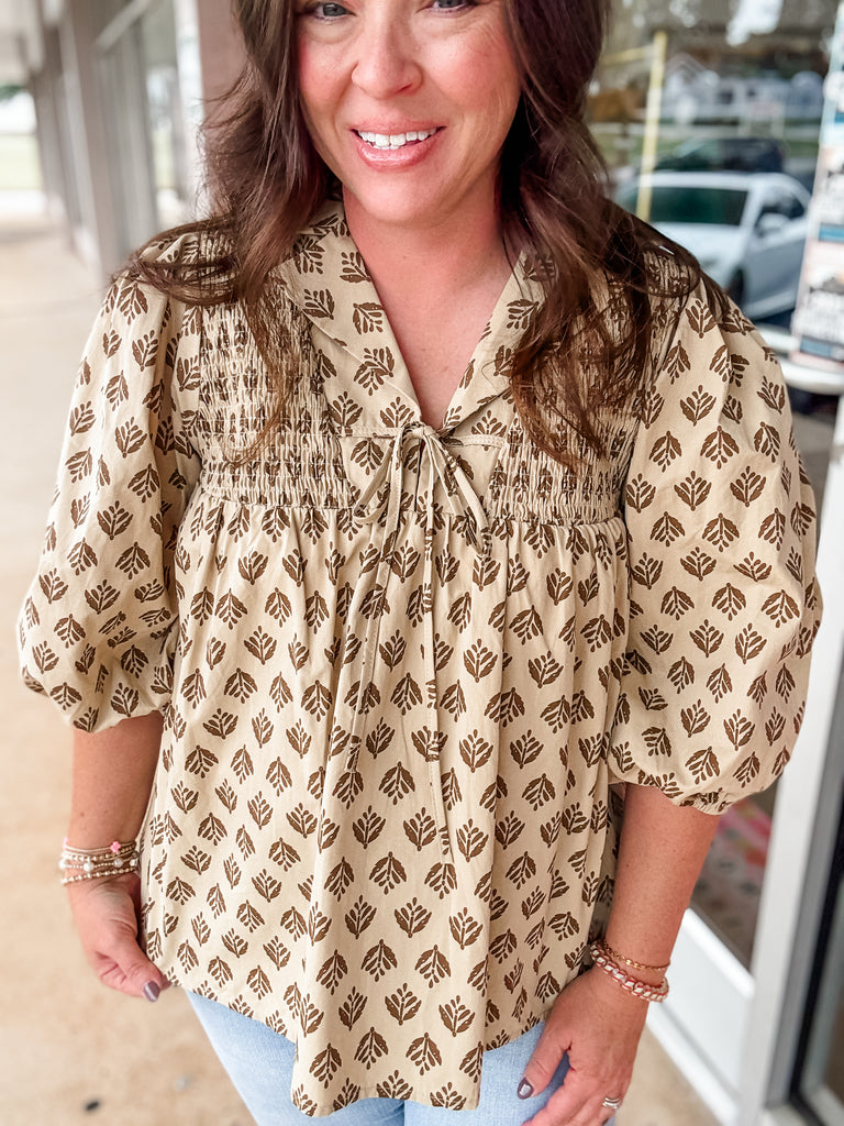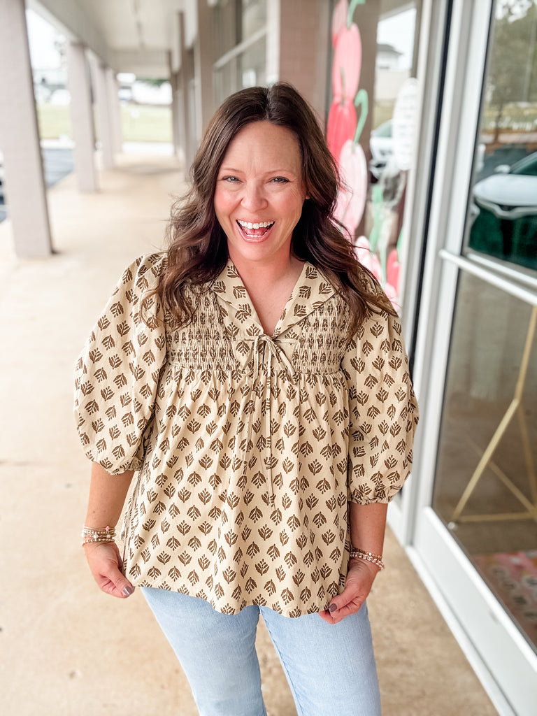 The Golden Meadow Smocked Blouse is a perfect blend of charm and comfort. Featuring a soft beige base with earthy golden leaf prints, this blouse is elevated with a smocked bust, tie-front detail, and billowy sleeves for a feminine touch. Its relaxed yet flattering fit makes it versatile for both casual outings and dressier occasions. Pair it with jeans for an easy everyday look or layer with a skirt and boots for a chic fall vibe.