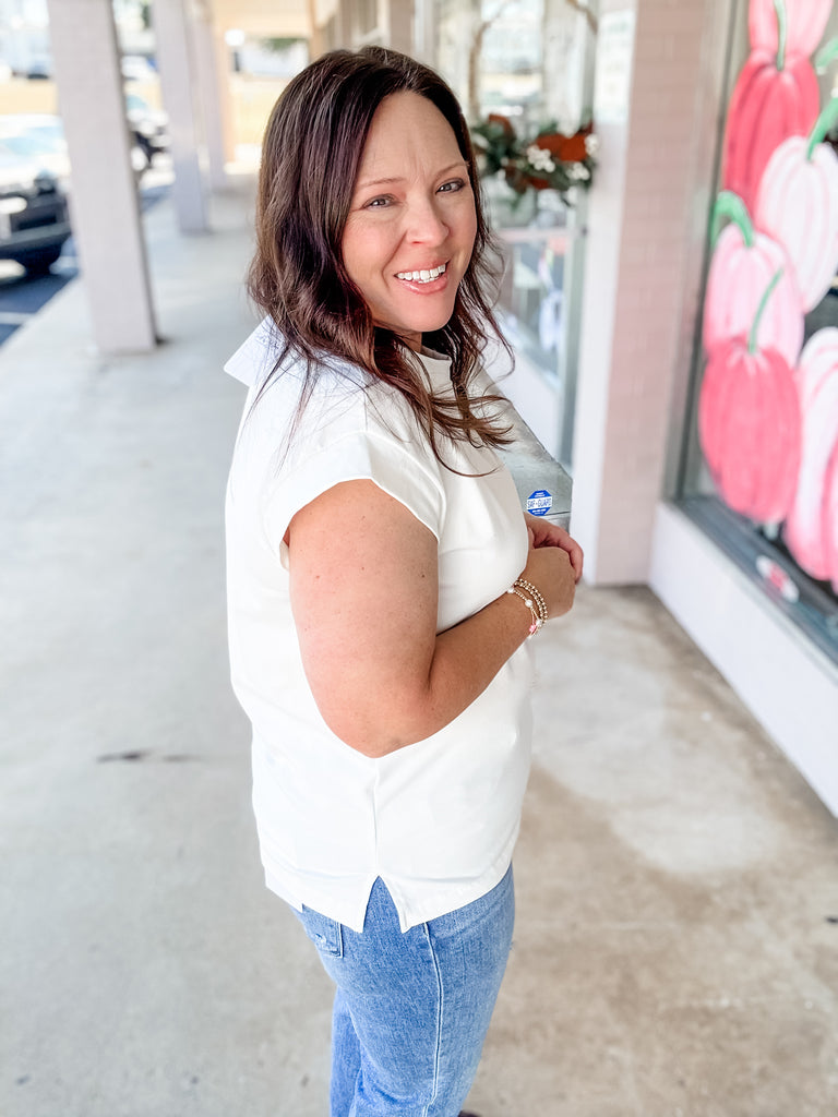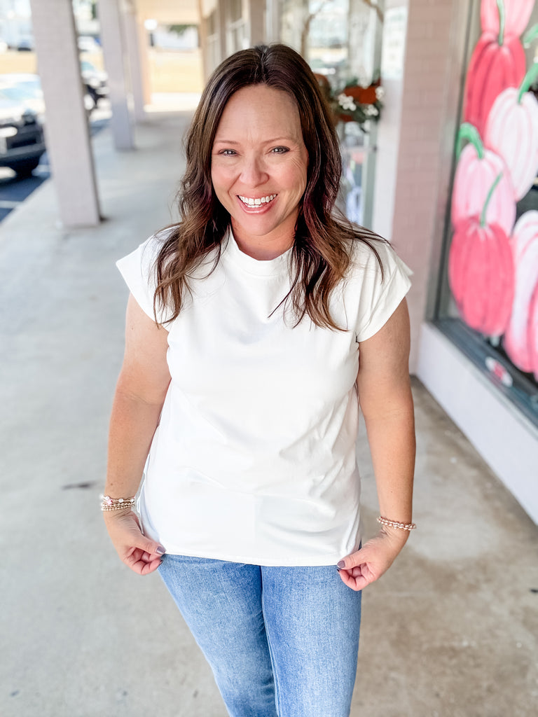 Keep it simple, timeless, and effortlessly chic with our Everyday Essential Tee. Designed with a relaxed fit, rolled cap sleeves, and soft breathable fabric, this versatile white top pairs perfectly with anything in your closet—from distressed denim to flowy skirts. Whether you’re layering it under a blazer for work or wearing it solo for a casual day out, this is the classic piece you’ll reach for again and again.