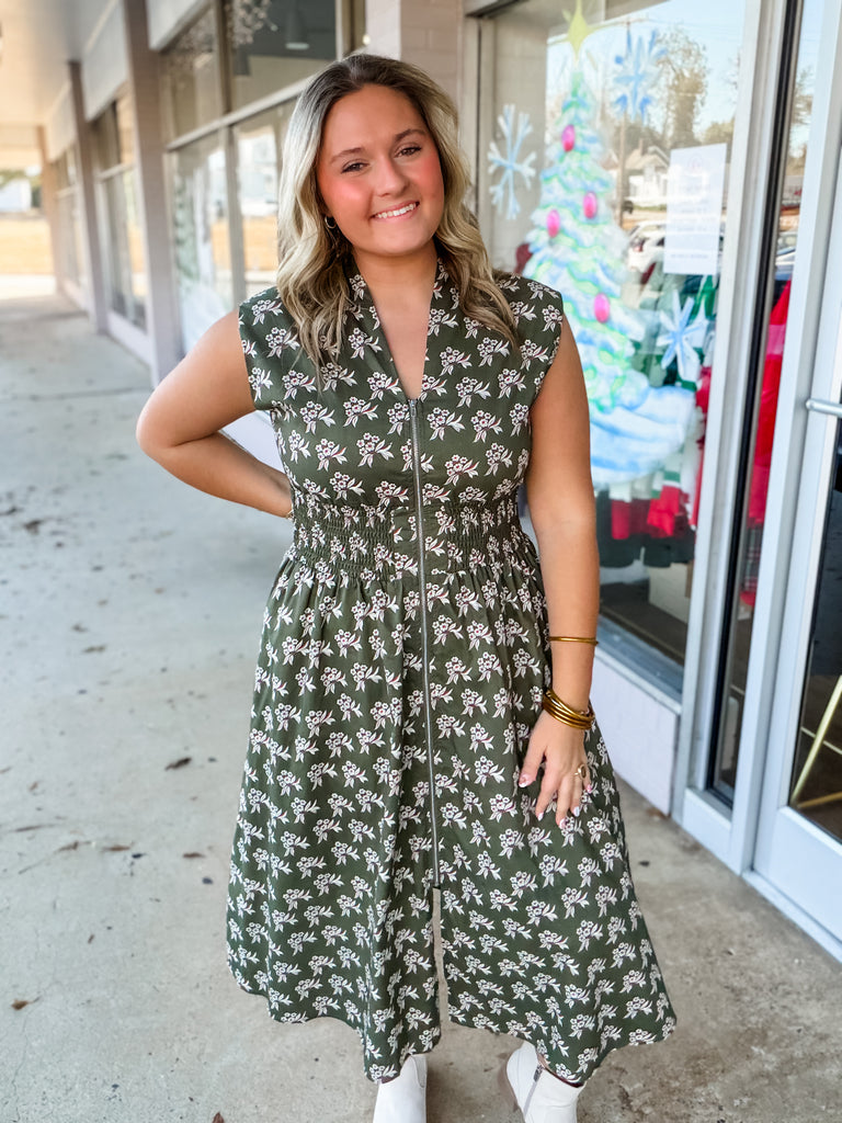 Fresh, flattering, and effortlessly pretty — the Olive Blossom Zip Dress is your new go-to for every occasion. Featuring a soft olive background with delicate floral prints, this best-selling dress combines feminine charm with casual ease. The front zip detail and smocked waist create a flattering silhouette, while the flowy skirt moves beautifully with every step. Pair it with sandals for a sunny day out or layer with a cardigan and boots for a cozy fall look.