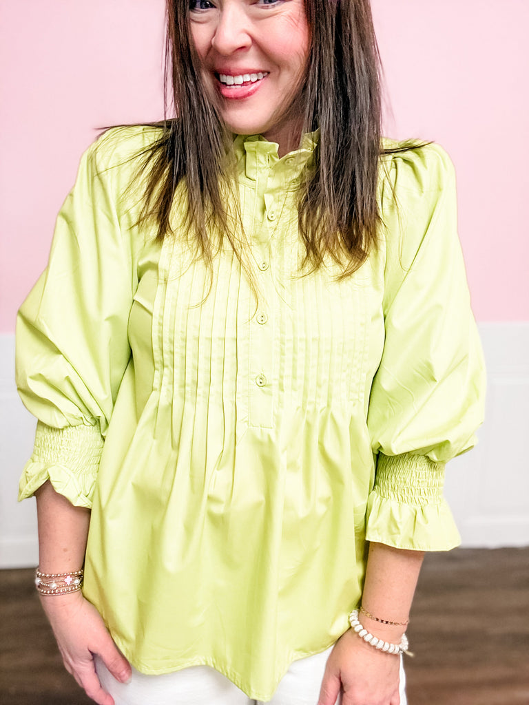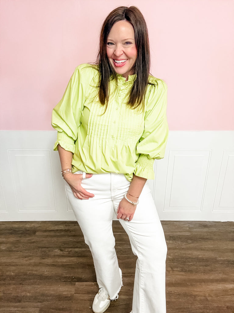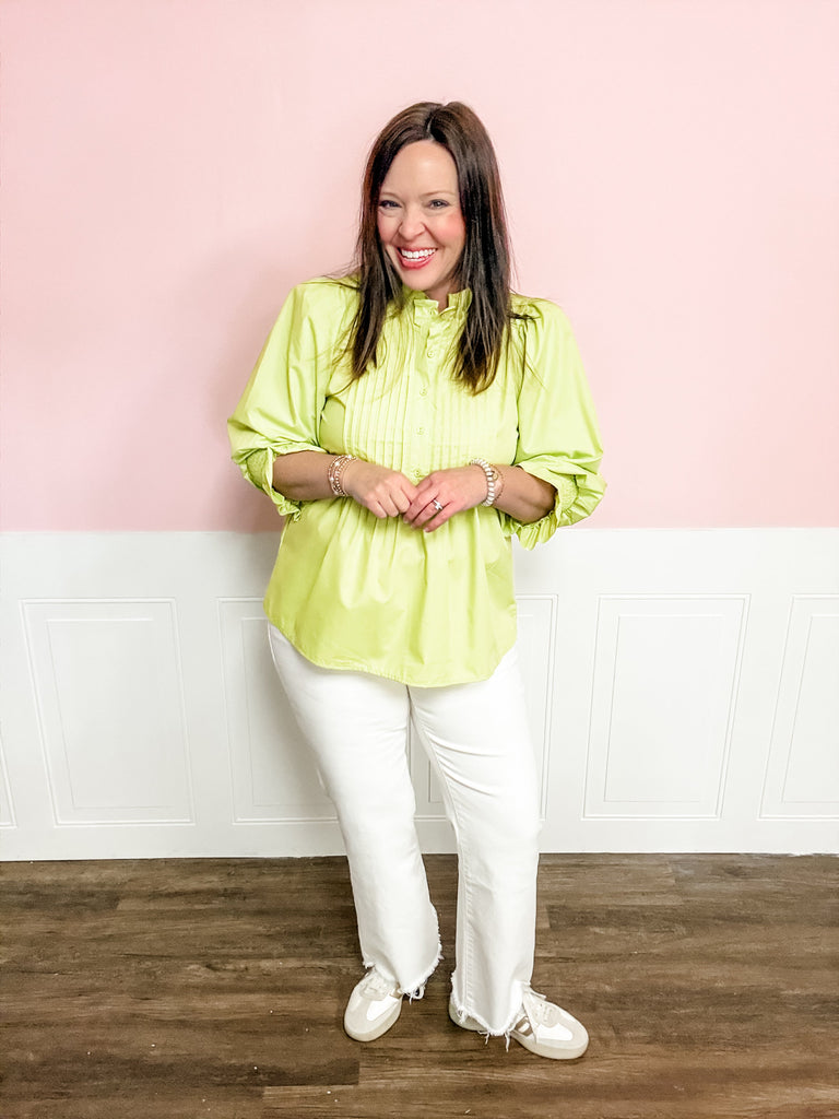 Bright, happy, and so easy to wear. This chartreuse blouse features classic pintuck detailing down the front, a softly ruffled neckline, and puff sleeves with smocked cuffs for a flattering, comfortable fit. The lightweight woven fabric gives it that polished look while still feeling effortless—perfect for workdays, church, or dressing up your everyday denim. It’s one of those tops that does all the talking without trying too hard. Pair it with white jeans, light wash denim, or even patterned pants for a fun spring look.