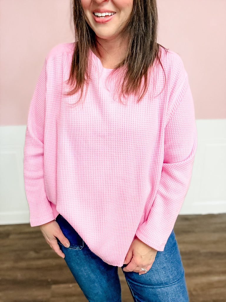 Easy, comfy, and just plain cute. This pink waffle knit top has that perfectly worn-in feel with a relaxed fit you’ll reach for again and again. Featuring a soft textured body, subtle contrast sleeves, and a longer length that gives great coverage, it’s an everyday favorite. Lightweight enough for layering but cozy enough to wear on its own—perfect for errands, workdays, or lounging in comfort while still looking put together.