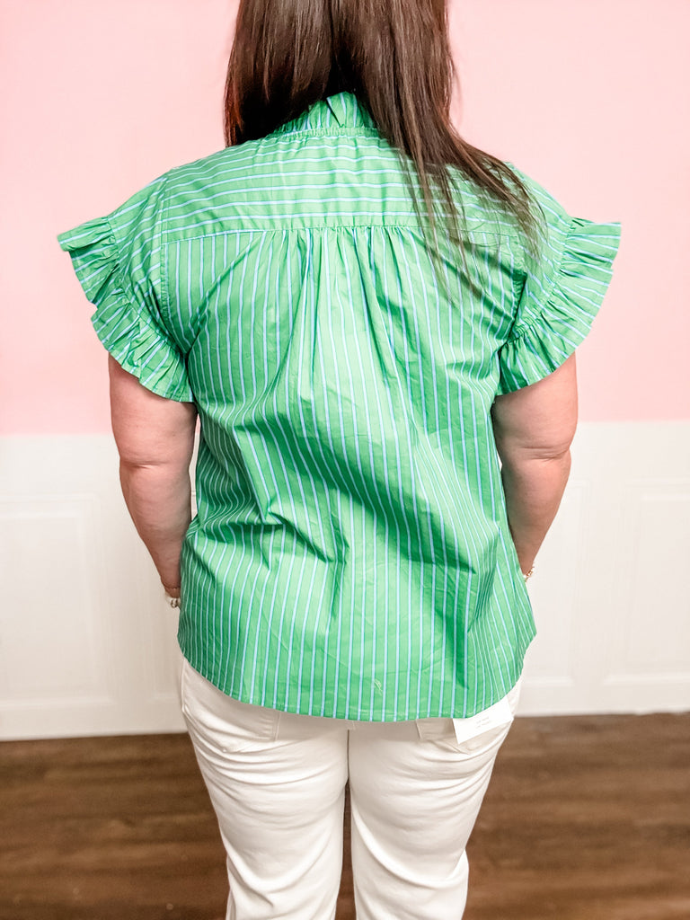 A classic stripe with the cutest details. This green and white striped blouse features a soft ruffled neckline, flutter sleeves, and a ruffle-trim button front that adds just the right amount of charm. Lightweight and easy with a relaxed fit, it’s comfortable enough for everyday wear while still feeling polished for work or church. Pair it with white denim, trousers, or a fun colored pant for a fresh, happy look you’ll love all season long.