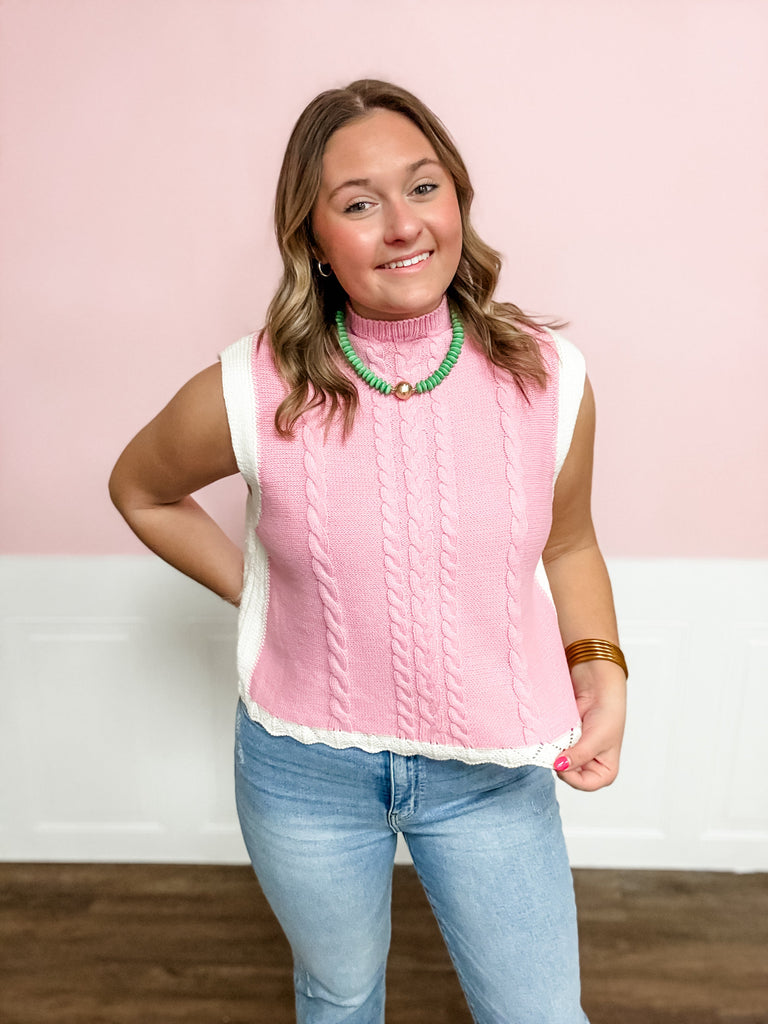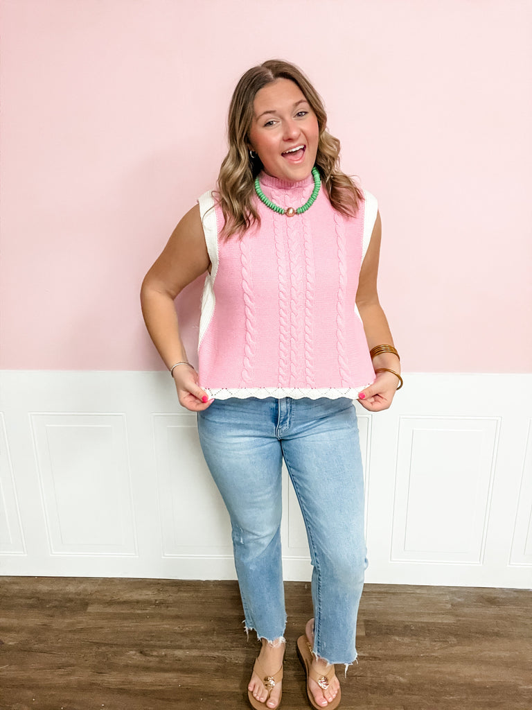 Sweet, soft, and so versatile. This pink cable knit sweater vest features classic textured stitching with creamy contrast trim for a clean, polished look. The sleeveless silhouette makes it perfect for layering over a crisp button-down now or wearing solo as the weather warms up. Cozy without being bulky, it’s an easy piece for work, church, or everyday styling. Pair it with white denim, trousers, or a patterned skirt for a timeless spring outfit you’ll love reaching for.