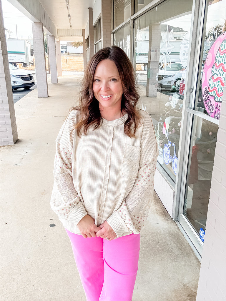 Sweet, soft, and full of charm — the Prairie Bloom Waffle Top is the perfect blend of cozy texture and feminine detail. Featuring a lightweight waffle knit body, dainty floral patchwork sleeves, lace accents, and a ruffled hem, this top brings vintage-inspired beauty to your everyday style. The relaxed fit and mixed fabrics give it that easy, lived-in look we love. Pair it with denim or leggings for a perfectly effortless outfit with a touch of romance.