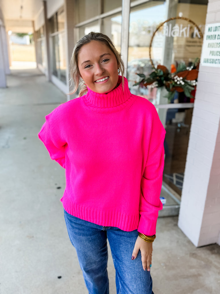 Make a bold statement with the Fuchsia Glow Sweater, your new go-to for cozy and chic style. Featuring a slouchy turtleneck, relaxed drop-shoulder fit, and ribbed detailing at the cuffs and hem, this vibrant pink knit is equal parts comfy and eye-catching. Perfect for pairing with jeans, leggings, or a fun skirt, it’s the ultimate pop of color for chilly days.