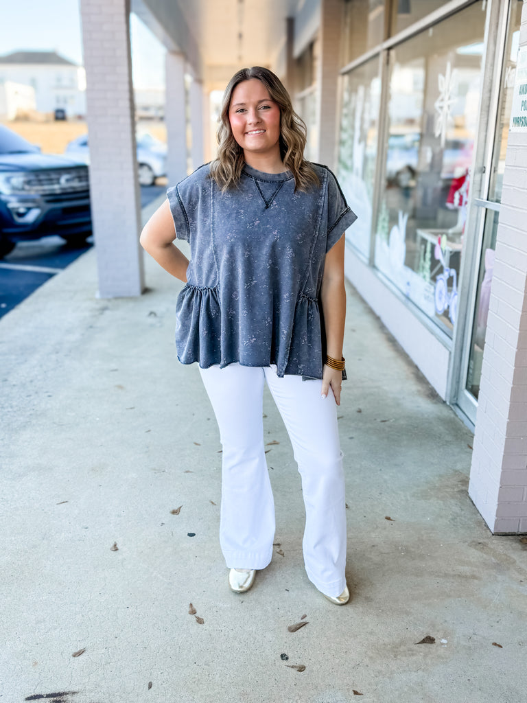 Sweet meets edgy in this washed charcoal floral peplum top! Featuring a soft vintage-wash look, tiny scattered wildflower print, and an easy relaxed fit, this top is the definition of comfy-cute. The ruffled peplum hem adds the perfect feminine touch, while the cap-style sleeves and exposed seam detail keep it laid-back and trendy. Pair it with skinny jeans or shorts for an effortless everyday outfit!