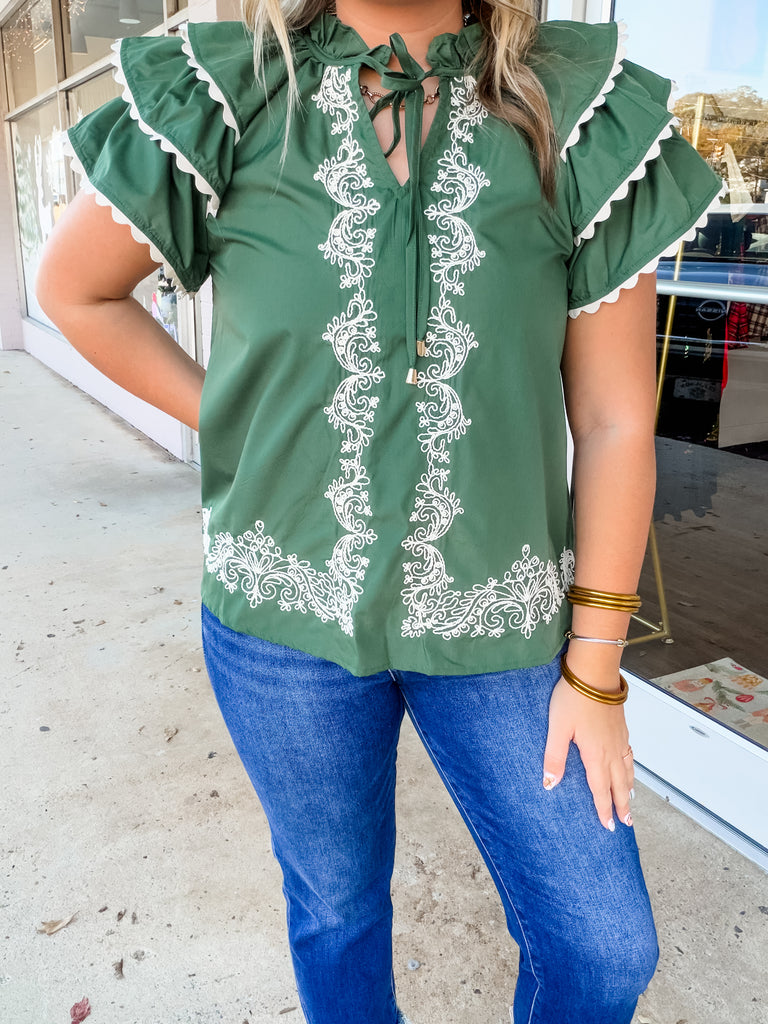 Step into timeless charm with our Evergreen Lace Peasant Blouse. This deep forest-green top features romantic ivory embroidery along the front and hemline, giving it an heirloom feel. The ruffled sleeves are finished with scalloped trim for a soft, feminine touch, while the tie-front neckline adds an effortless boho flair. Perfect for pairing with jeans or a midi skirt for a look that feels both rustic and refined.