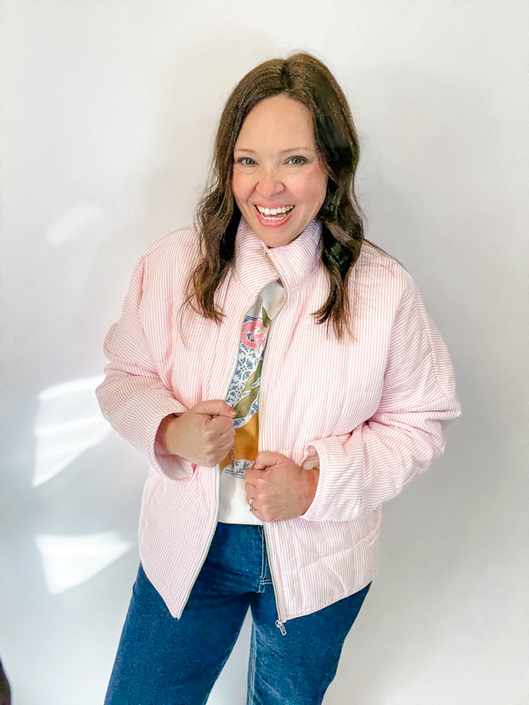 Wrap yourself in the sweetest touch of cozy with our Blush Stripe Quilted Jacket. Featuring soft cotton-candy pink pinstripes and a plush quilted design, this zip-up brings the perfect blend of warmth and charm. The standing collar gives it that elevated, on-trend look while the lightweight puff keeps you comfy without the bulk. Finished with deep side pockets (hello, essentials!), this jacket is your go-to for school runs, weekend outings, and every chilly day in between. Soft, feminine, and effortlessly cute—this one is a boutique must-have.