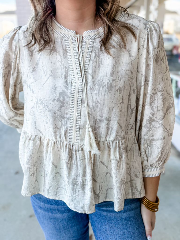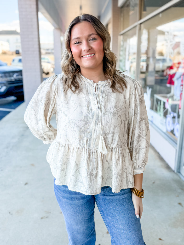 Soft, airy, and effortlessly elegant. The Morning Willow Top features a beautiful light neutral base with a subtle marbled floral texture that feels fresh and refined for spring. Designed with a flattering peplum silhouette, relaxed fit, and delicate trim detailing along the neckline and sleeves, this blouse is equal parts comfortable and polished. Lightweight and breathable, it’s perfect for pairing with denim, white jeans, or dressed up with tailored pants.