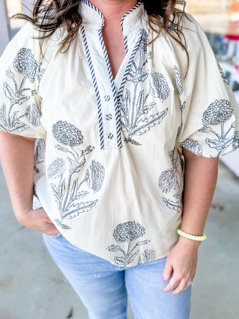 Bring effortless charm to your wardrobe with this airy cream blouse featuring delicate navy botanical embroidery throughout. The split neckline is trimmed with a subtle striped detail, adding a touch of contrast that elevates the entire look. Soft, billowy sleeves with gathered cuffs create a relaxed yet feminine silhouette. Lightweight, breathable, and beautifully detailed—this best-seller style pairs perfectly with denim, trousers, or shorts for an instantly polished, free-spirited outfit.