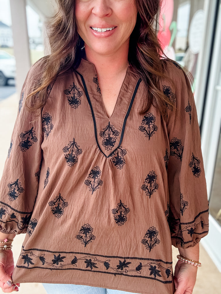 Bring a touch of earthy elegance to your wardrobe with the Woodland Bloom Blouse. The soft mauve base with bold black floral embroidery creates a timeless, boho-inspired look. Billowy sleeves and a relaxed fit make it an easy, flattering piece for everyday wear—perfect with denim or layered under a cozy cardigan.