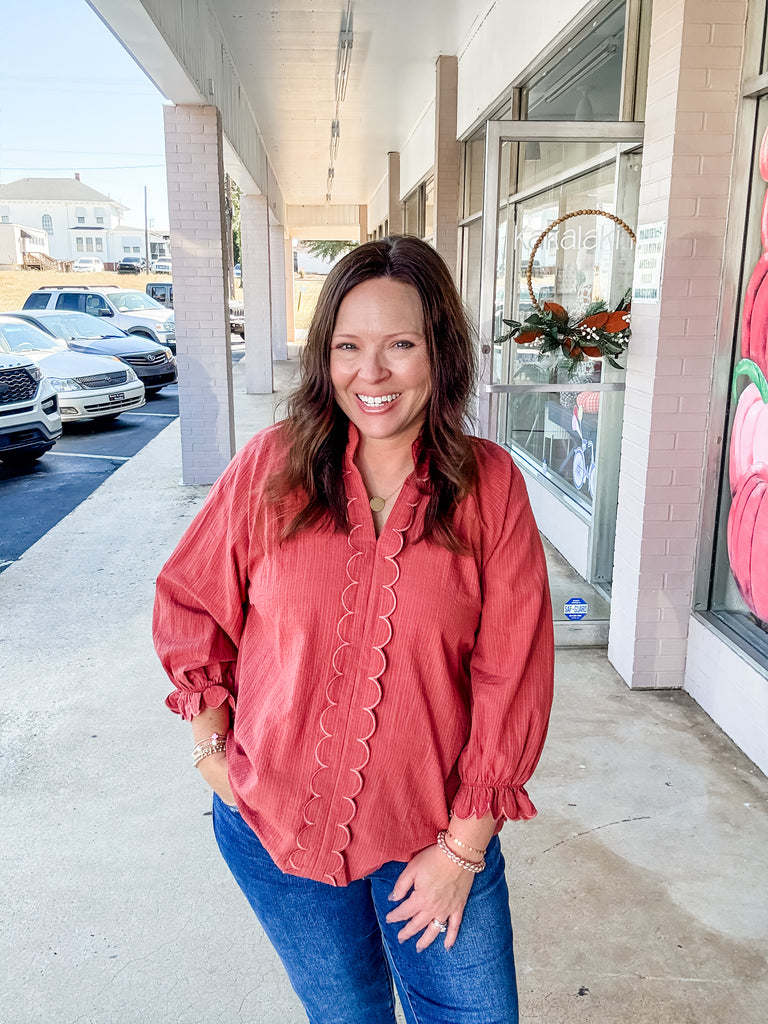 Simple yet chic, the Rustic Rose Scallop Top features a warm terracotta hue that’s perfect for the season. The standout detail is the scalloped trim framing the neckline and front, adding a touch of feminine charm to its relaxed look.