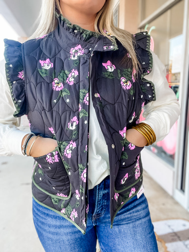 The Meadow Heart Quilted Vest blends rustic charm with feminine flair. Featuring a deep olive base stitched in soft heart-shaped quilting and accented with delicate pink floral blooms, this vest is both cozy and eye-catching. Ruffle-edged sleeves and contrast trim add a touch of sweetness, while the front pockets keep it practical for everyday wear. Perfect layered over a turtleneck or flannel for that cottage-meets-country feel you’ll reach for all season long.