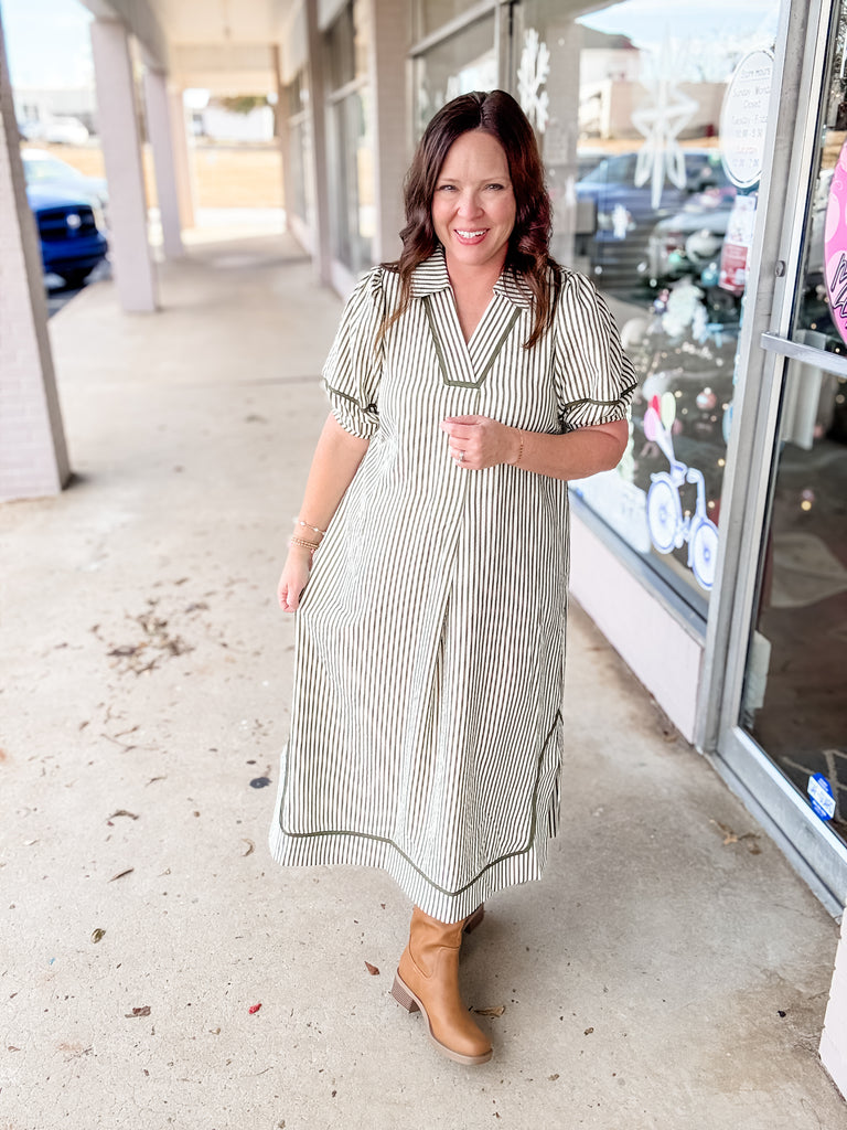 Effortlessly cool and endlessly versatile — the Olive Lane Stripe Dress is a must-have for every season. Designed with a crisp green and ivory stripe pattern, this collared dress features a relaxed fit, short sleeves, and contrast trim for a touch of structure. The soft, lightweight fabric keeps it breezy and comfortable, making it perfect for workdays, weekend outings, or casual brunches. Style it with sneakers for a laid-back vibe or boots for an elevated look.