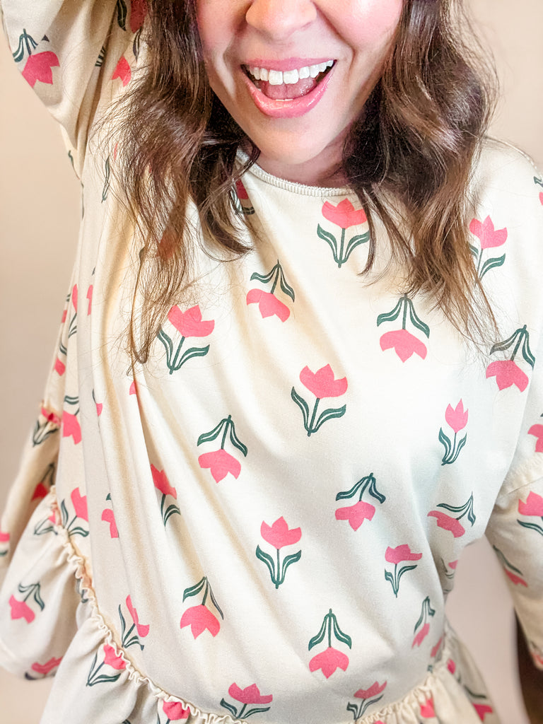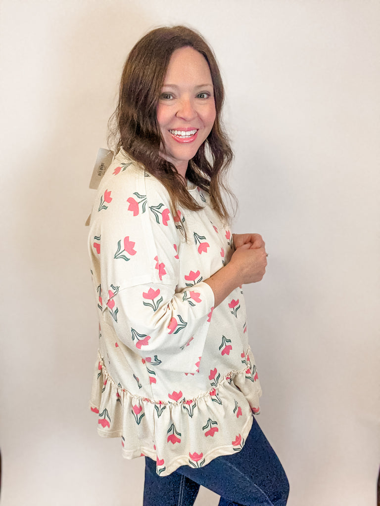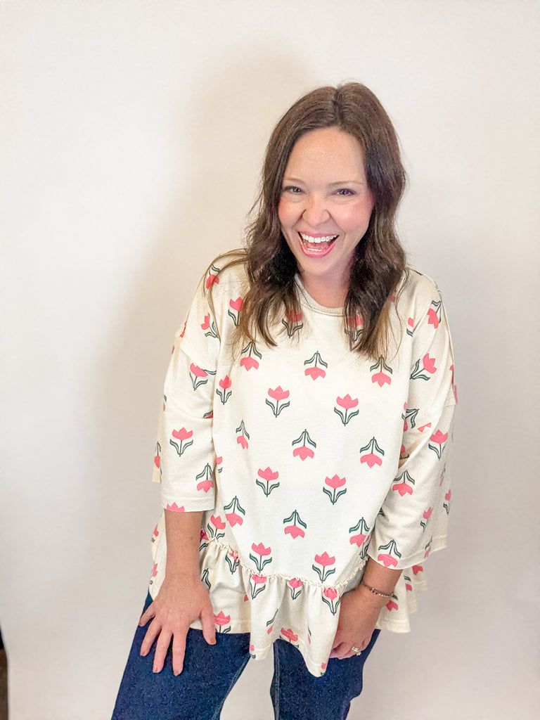 Fresh, playful, and perfectly spring, the Tulip Lane Ruffle Top features a darling tulip print in soft pink and green on a creamy backdrop. The relaxed fit and ruffled hem add the cutest touch of movement, making it a must-have for sunny days, brunch dates, or Easter festivities. Lightweight, comfy, and irresistibly cheerful!