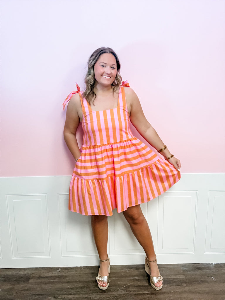 This one was made for a Saturday in Tiger Town. The Tiger Bow Stripe Dress features bold orange and pink stripes with the sweetest adjustable bow tie straps for a feminine touch. The tiered silhouette gives it that easy, relaxed fit we all love — comfortable enough for tailgates, cute enough for dinner after the win. The lightweight fabric keeps it breathable for those warm Upstate game days, and the flowy shape makes it flattering without feeling clingy.