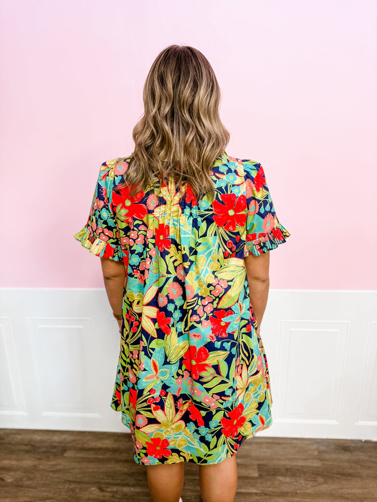 If color makes you happy, this dress is about to be your new favorite. The Garden Party Ruffle Midi Dress features a bold floral print in rich greens, reds, pinks, and blues that feels vibrant without being overwhelming. The ruffle-trimmed neckline and pleated front detail add feminine texture, while the relaxed midi silhouette keeps it easy and comfortable for all-day wear. The lightweight fabric moves beautifully, and the length makes it perfect for work, church, showers, or spring events.