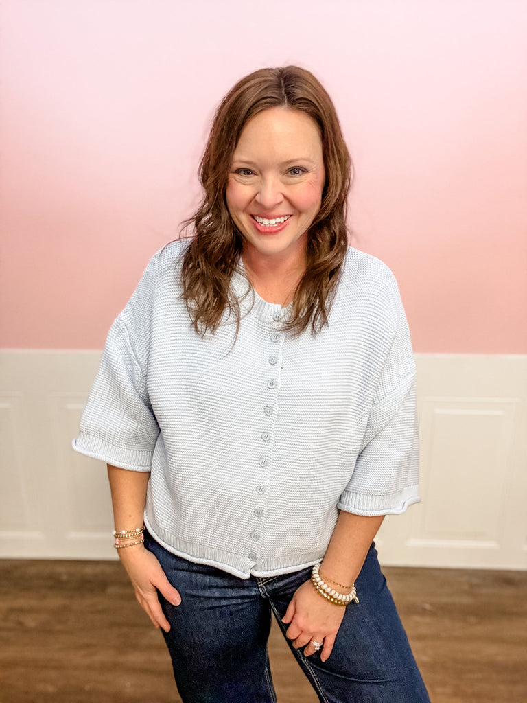 Easy, cozy, and perfectly polished, the Blue Skies Knit Cardigan is a layering staple you’ll wear on repeat. This soft light-blue cardigan features a textured knit, classic button-front design, and a relaxed, slightly cropped silhouette for an effortlessly flattering fit. Lightweight yet cozy, it’s ideal for throwing on over dresses, pairing with high-rise denim, or styling buttoned up as a top. A timeless piece that works from season to season.