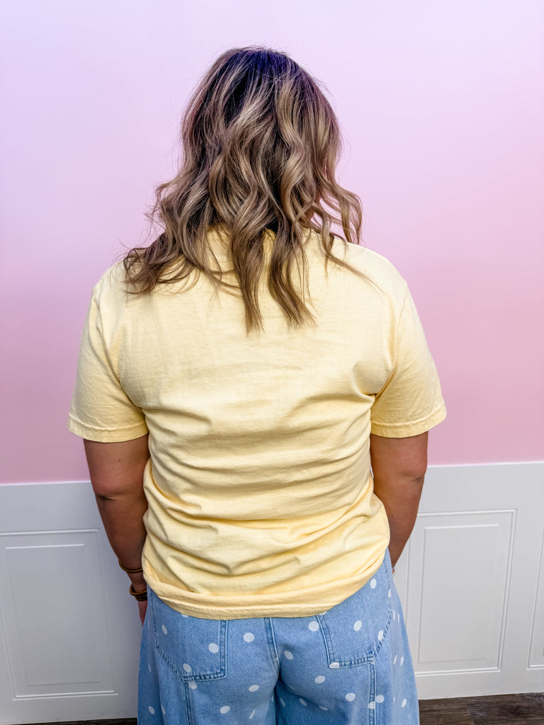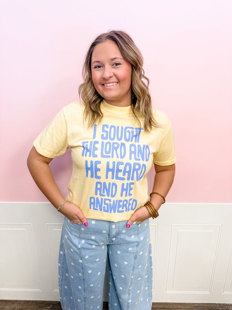 Our He Heard & Answered Graphic Tee features a cheerful yellow base with bold blue lettering that makes a statement without feeling heavy. It’s bright, uplifting, and easy to wear — the kind of piece that sparks conversations in the sweetest way.