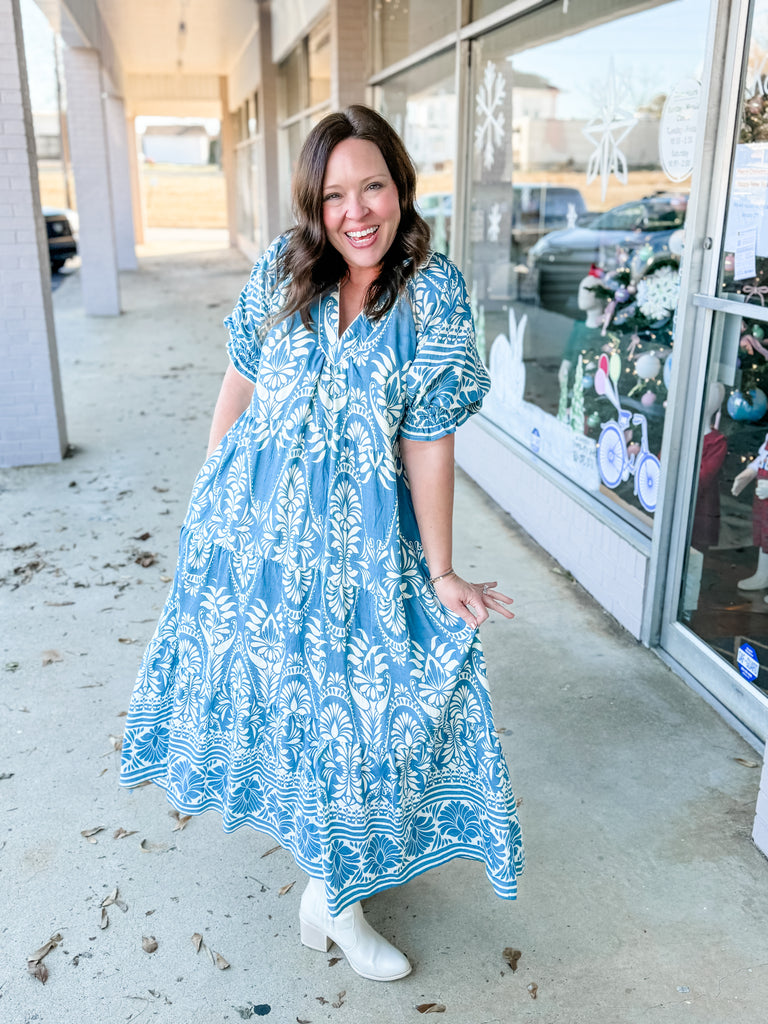 Timeless and effortlessly feminine, the Blue Willow Garden Dress features a soft denim-blue base with an intricate ivory botanical print that feels both classic and fresh. Designed with a relaxed, flowy silhouette, this dress includes a flattering split neckline with delicate piping detail and softly gathered long sleeves with smocked cuffs for a romantic touch. Lightweight and comfortable, it’s perfect for brunch, church, or everyday wear. Style it with sandals for daytime or dress it up with wedges and statement earrings for an elevated look.