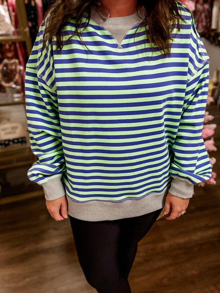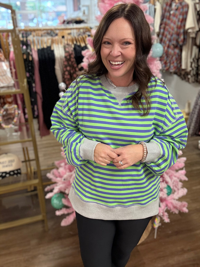 Add a pop of playful color to your everyday look with the Coastal Breeze Striped Pullover! This comfy lightweight sweatshirt features vibrant lime and navy stripes with classic gray trim for that perfect laid-back vibe. The soft, relaxed fit makes it ideal for breezy days, casual outings, or cozy weekends. Pair it with your favorite denim or leggings for an effortlessly cute and sporty look.