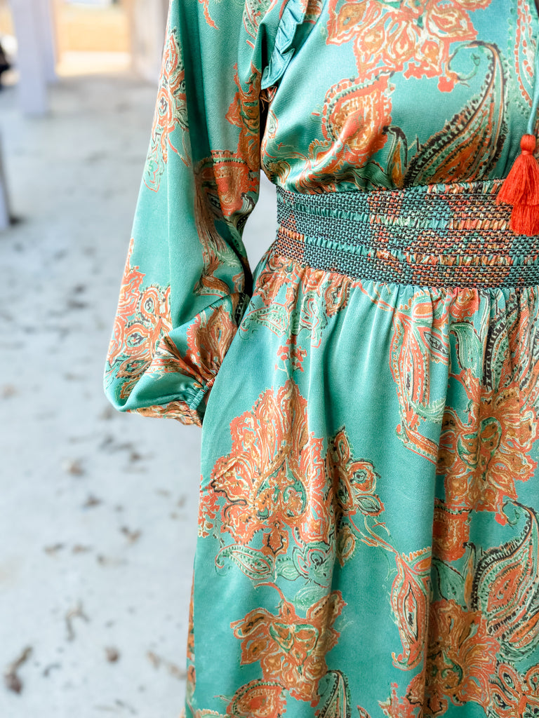 Romantic, breezy, and blooming with soft color, the Buttercup Breeze Midi Dress is made for spring days. The paisley floral pattern pops against the airy green backdrop, and the smocked waist creates a dreamy fit. Flowy sleeves and a tiered skirt complete the look—effortless, feminine, and perfect for sunshine-filled moments.