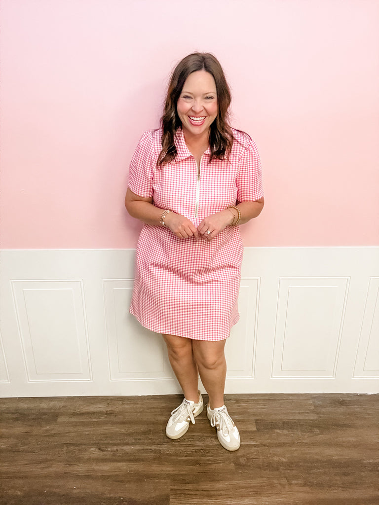 Sweet, classic, and perfect for sunny days—the Picnic in Pink Gingham Dress is a timeless piece you’ll reach for all season long. Featuring a cheerful pink and white gingham print, this dress has an easy, relaxed fit that’s comfortable and flattering for everyday wear. The simple collar and short sleeves keep the look polished, while the lightweight fabric makes it perfect for warm spring and summer days. Whether you’re heading to church, brunch with friends, or a weekend outing, this dress pairs beautifully with sandals or wedges for an effortless outfit. It’s the kind of classic style that never goes out of season.