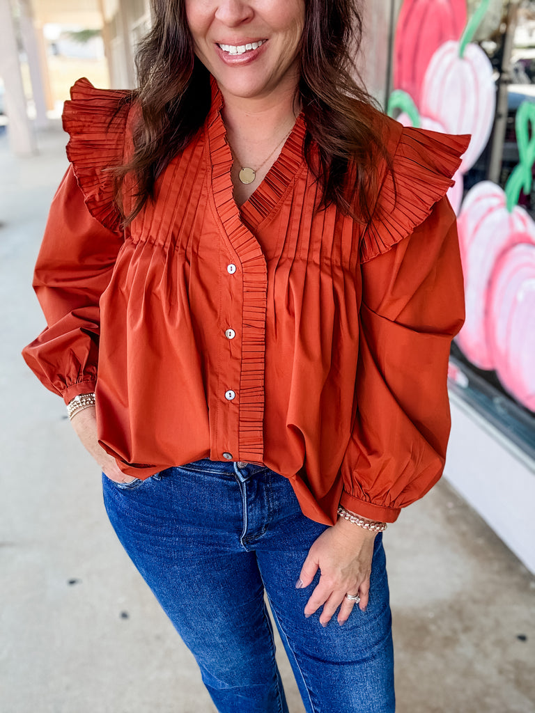 Rich in detail and color, the Autumn Pleats Blouse is your go-to for effortless fall style. Featuring a warm rust hue, this top is designed with delicate pleated trim along the neckline, shoulders, and button-down front for a textured, feminine touch. Its flowy fit and lightweight feel make it easy to dress up with trousers or keep casual with jeans and booties.