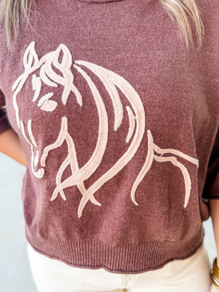 Soft, cozy, and full of rustic charm — this cocoa-brown knit top features a beautiful cream outline of a horse, giving it that perfect Western-inspired flair. The relaxed short-sleeve silhouette, ribbed neckline, and soft sweater fabric make it an effortless transitional piece you can dress up or keep casual. Pair it with jeans, boots, or a denim jacket for an easy bout
