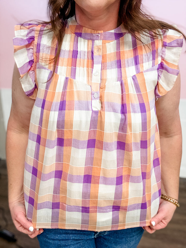 The Peach Orchard Plaid Ruffle Top brings together soft peach, lavender, and cream in the happiest plaid print. It’s lightweight, breathable, and easy to wear — but the ruffle sleeve detail is what makes it feel special.