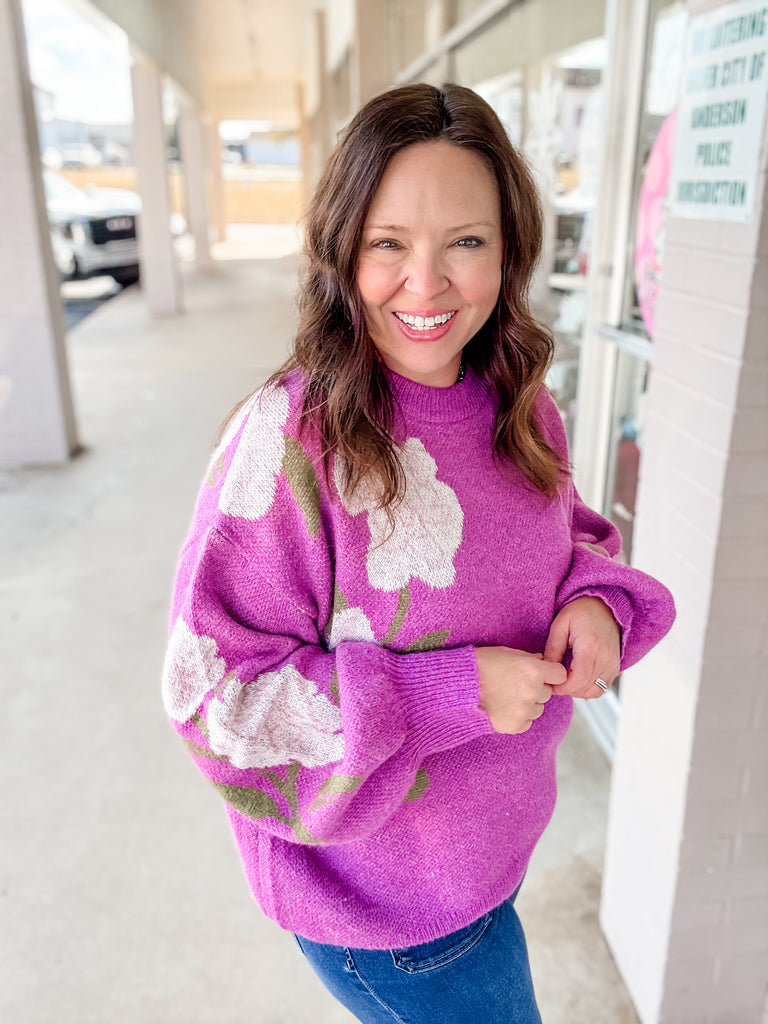 Soft, sweet, and effortlessly feminine — this cozy knit sweater brings a pop of charm to any outfit. Its rich orchid-pink base is beautifully accented with oversized ivory floral detailing along the shoulder and sleeve, giving it a romantic, hand-stitched look. The relaxed fit, ribbed hemline, and comfy crew neckline make it perfect for everyday wear. Pair it with denim or leggings for a pretty, polished style that feels as cozy as it looks.