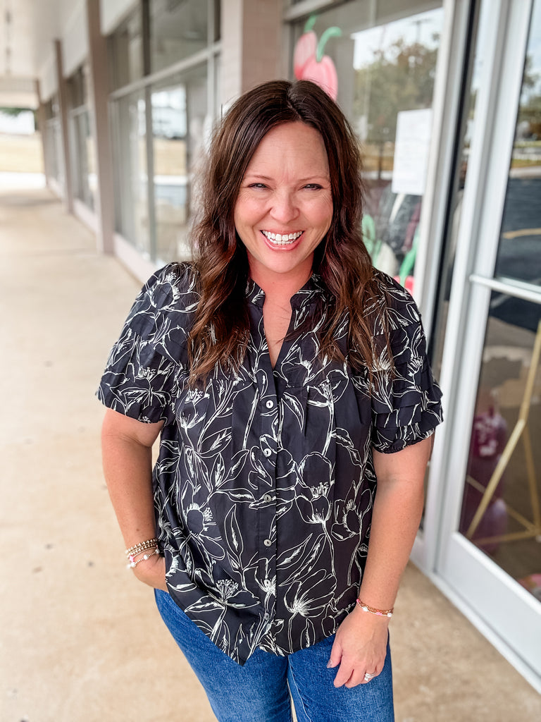 Bold yet timeless, the Midnight Bloom Button Blouse features a striking black backdrop with delicate white floral outlines that give it an elegant, hand-drawn feel. The button-down front adds classic charm, while the puff sleeves with elastic cuffs bring a soft, feminine touch. Easy to style tucked into jeans or layered under a jacket, this blouse is a versatile piece that works from casual outings to dressy evenings.