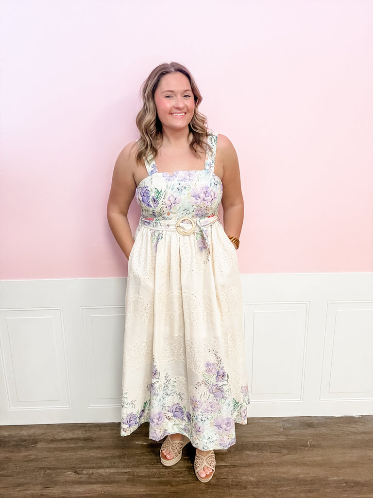 Soft, feminine, and perfect for spring Sundays, the Lilac Promise Maxi Dress features a dreamy pastel floral print in lavender, sage, and soft cream tones. Designed with wide shoulder straps, delicate lace trim at the bodice, and a flowing full-length maxi skirt, this dress feels effortless yet polished. The back zipper provides a flattering, structured fit while the lightweight fabric keeps it comfortable and easy to wear. A beautiful choice for Easter Sunday, church, bridal or baby showers, and all of your spring gatherings.