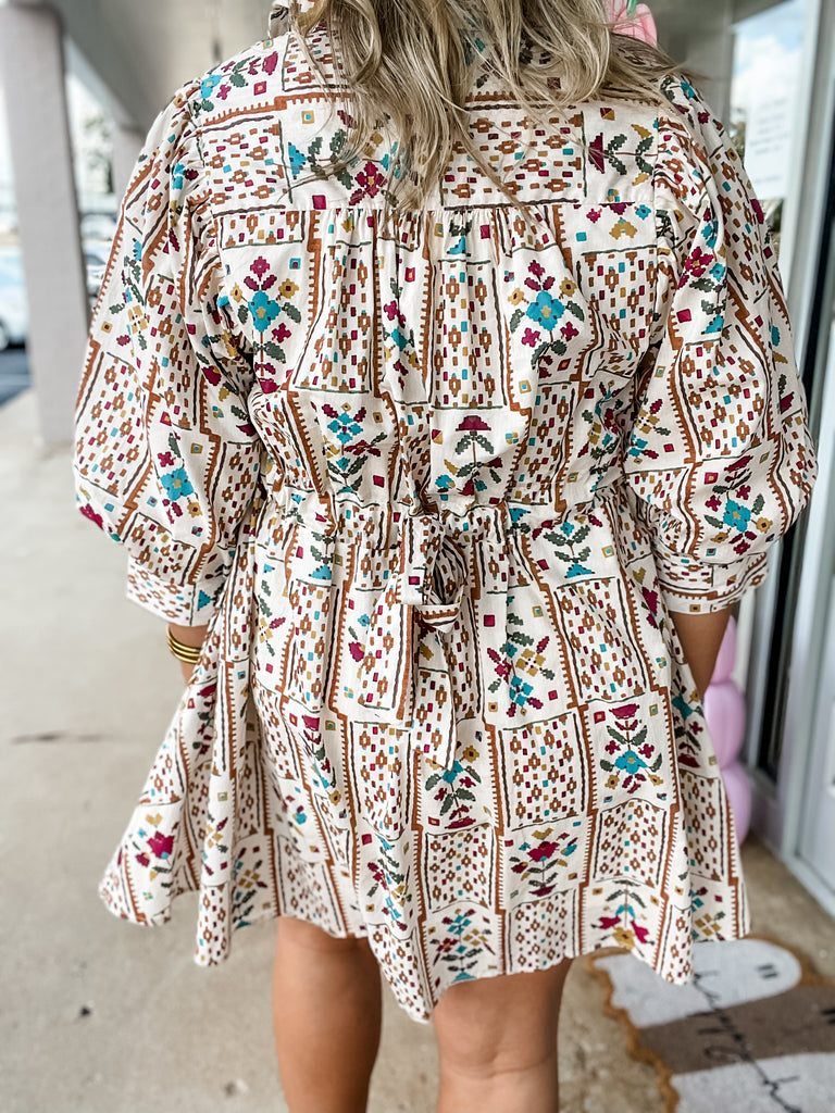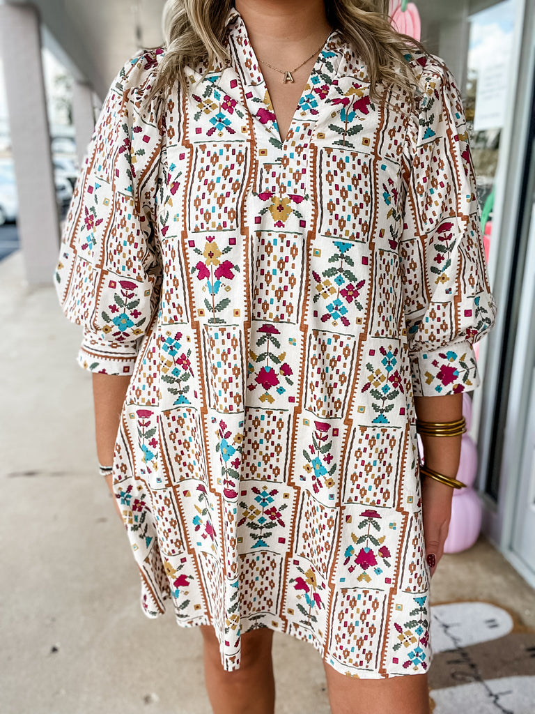Bring a touch of charm and comfort to your wardrobe with this midi dress featuring a playful mosaic-inspired floral print. The soft cream base is accented with pops of burgundy, mustard, and teal for a warm, artisan feel. Designed with roomy side pockets for everyday ease and a relaxed fit that flatters, this dress is perfect for layering with boots and a denim jacket in cooler weather or wearing solo with sandals on sunny days. A versatile piece that blends boho beauty with practical style.