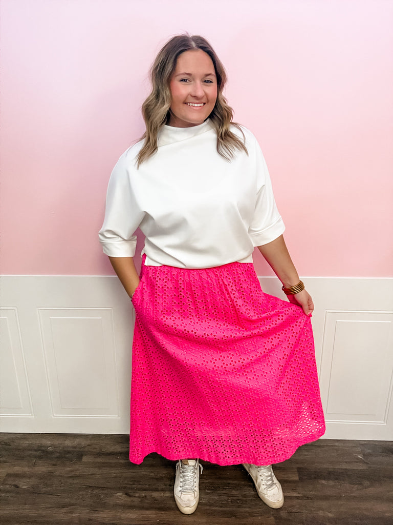 Bold, breezy, and made for sunny days, the Berry Sweet Eyelet Maxi Skirt is a total statement piece. This vibrant berry-pink skirt features delicate eyelet detailing throughout, giving it a soft, romantic feel with just the right amount of texture. Designed with a comfortable elastic waistband, it offers an easy, flattering fit while flowing beautifully with every step. Lightweight and airy, this skirt is perfect for spring outings, summer vacations, or dressing up with a pretty blouse for church or brunch.