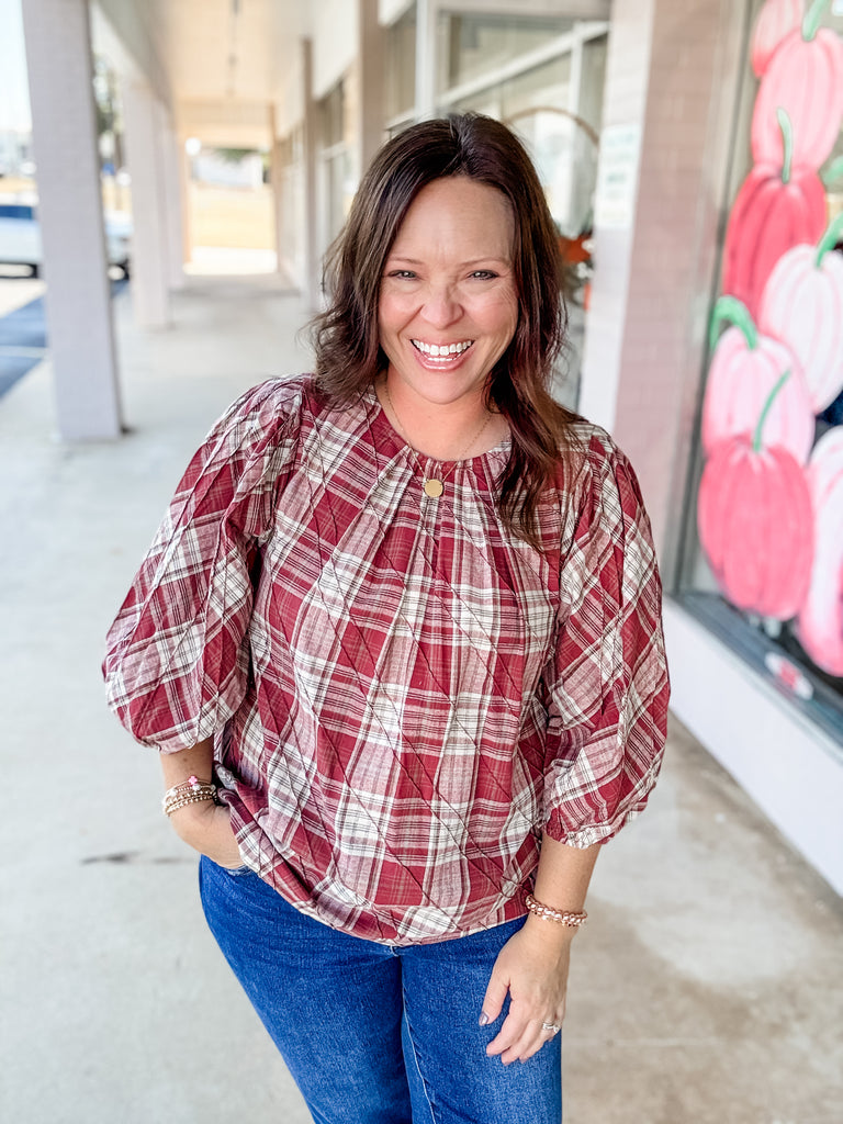 The Autumn Orchard Blouse is a cozy-chic nod to timeless fall style. Featuring a warm rust and cream plaid pattern, this top is elevated with puff sleeves, a round neckline, and a relaxed silhouette that drapes beautifully. Perfect for pairing with jeans and boots, it’s a versatile piece that transitions effortlessly from pumpkin patch days to casual evenings out.