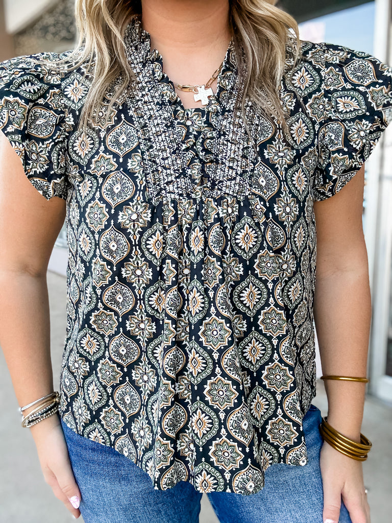 The Boho Mosaic Smocked Top is a statement piece that blends vintage-inspired patterns with modern ease. Featuring an intricate black and gold medallion print, this sleeveless blouse is elevated by its smocked v-neckline and soft ruffle trim. The flowy silhouette drapes effortlessly, making it just as perfect for work as it is for a weekend outing. Pair it with denim, skirts, or tailored pants for a versatile look with a touch of bohemian charm.