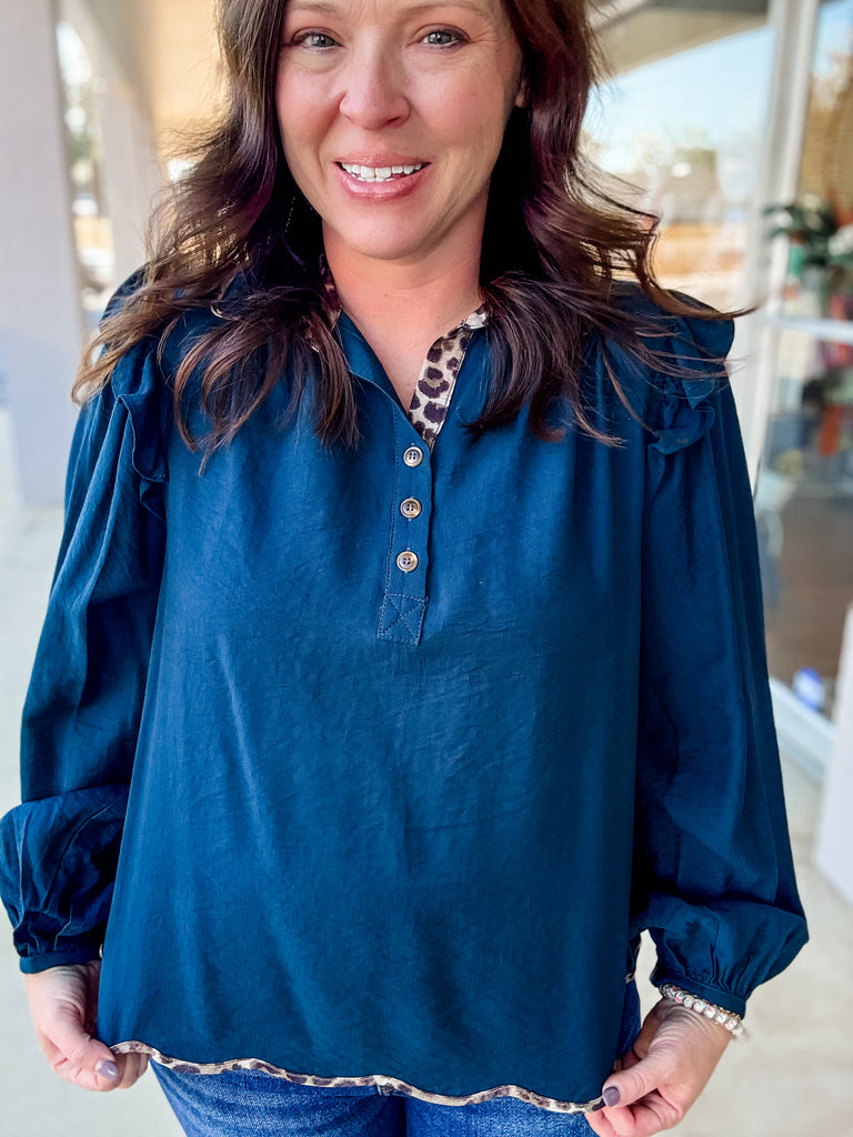 The Midnight Safari Blouse blends elegance with a touch of the wild. This deep teal top features a soft, flowy silhouette with subtle ruffle details along the shoulders and sleeves. The standout detail is its striking leopard-print trim—peeking from the collar, neckline, and hem for a playful yet polished contrast. Perfect for pairing with dark denim or black slacks, this blouse brings an effortless mix of chic sophistication and untamed charm to your wardrobe.
